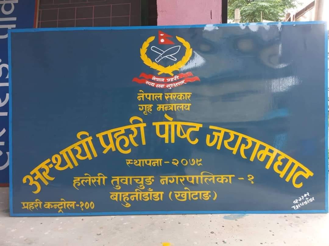 जयराम (खोटाङ) । जिल्लाको पश्चिमी प्रवेशद्वार जयराम (जैरुङघाट)मा अस्थायी प्रहरी पोस्ट स्थापना गरिएको छ । हलेसी तुवाचुङ नगरपालिका नगरप्रमुख बिमला राईले बुधबार अस्थायी प्रहरी पोस्ट उद्घाटन गरेकी हुन् ।
