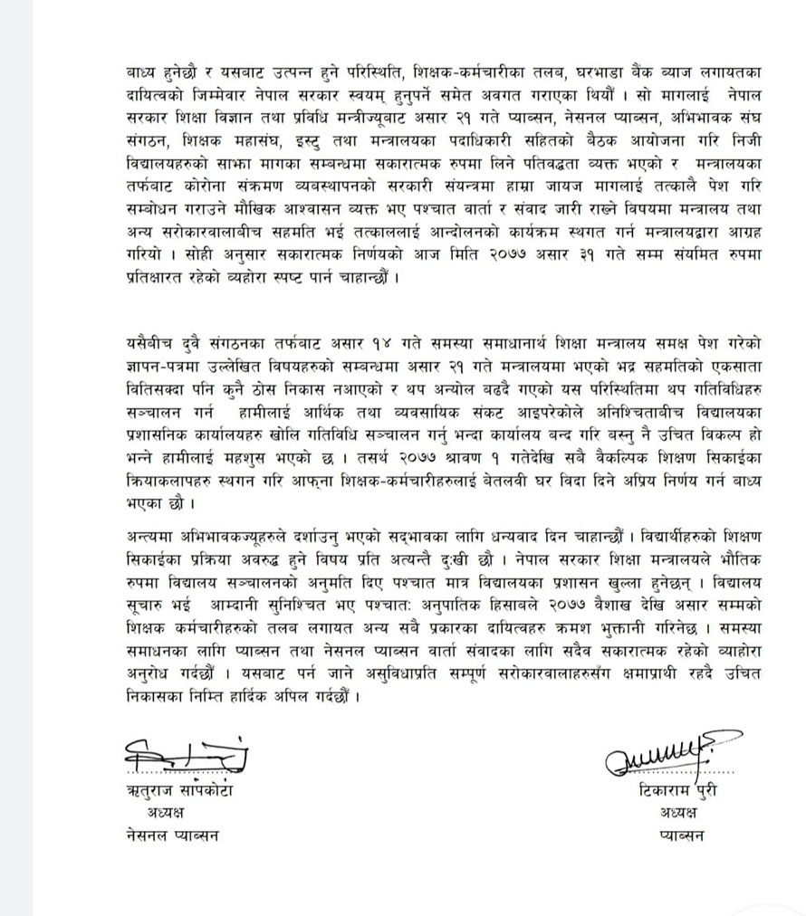 यसबाट उत्पन्न हुने परिस्थिति, शिक्षक–कर्मचारीका तलब, घरभाडा बैंक ब्याजलगायतका दायित्वको जिम्मेवार नेपाल सरकार स्वयम् हुनुपर्ने समेत अवगत गराएका थियौँ । सो मागलाई नेपाल सरकार शिक्षा विज्ञान तथा प्रविधि मन्त्रीज्यूबाट असार २१ गते प्याब्सन, नेसनल प्याब्सन, अभिभावक संघ, संगठन, शिक्षक महासंघ, इस्टु तथा मन्त्रालयका पदाधिकारीसहितको बैठक आयोजना गरी निजी विद्यालयको साझा मागसम्बन्धमा सकारात्मक रूपमा लिने प्रतिबद्धता व्यक्त भएको र मन्त्रालयका तर्फबाट कोरोना संक्रमण व्यवस्थापनको सरकारी संयन्त्रमा हाम्रा जायज मागलाई तत्कालै पेस गरी सम्बोधन गराउने मौखिक आश्वासन व्यक्त भएपश्चात् वार्ता र संवाद जारी राख्ने विषयमा मन्त्रालय तथा अन्य सरोकारवालाबीच सहमति भई तत्काललाई आन्दोलनको कार्यक्रम स्थगत गर्न मन्त्रालयद्वारा आग्रह गरियो । सोहीअनुसार सकारात्मक निर्णयको आज मिति २०७७ असार ३१ गतेसम्म संयमित रूपमा प्रतीक्षारत रहेको व्यहोरा स्पष्ट पार्न चाहन्छौँ ।