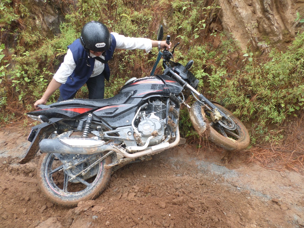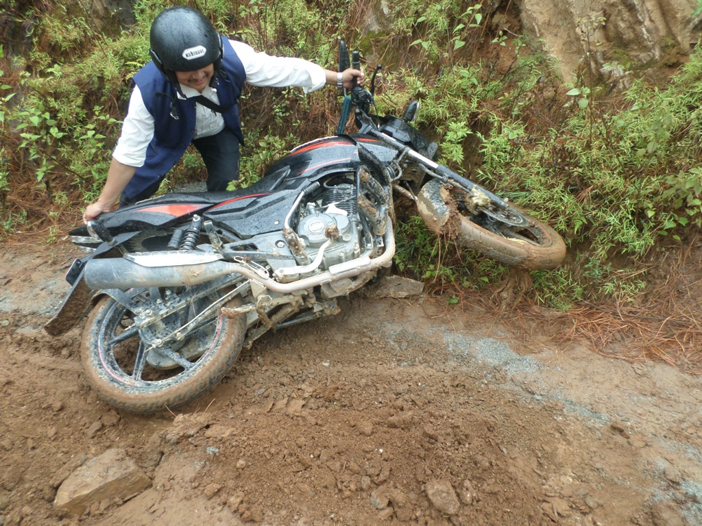 कतिपय अवस्थामा मोटरगार्डको हिलो निकाल्न नसकेर मोटरसाइकल डोर्याउनसमेत सकिँदैनथ्यो । सहयोग माग्ने अवस्था पनि थिएन । मोटरगार्डको हिलो जसोतसो फालेर मोटरसाइकल ‘स्टार्ट’ गर्दा लुगासमेत हिलैहिलो भए । जसोतसो हलेसी फक्र्यौं ।