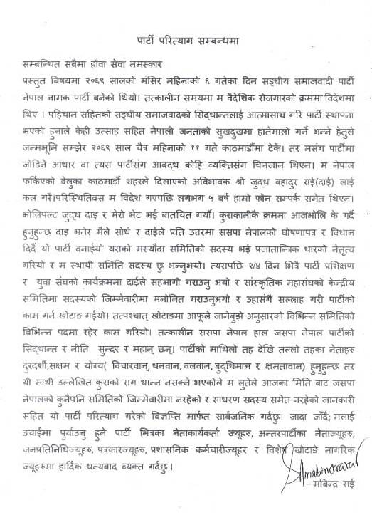 ‘समग्र पूर्वी पहाडमा जसपा कमजोर बन्दै गएको छ,’ अध्यक्ष राईको भनाइ छ, ‘जसपाको भविष्य अँध्यारो बन्दै गएपछि पनि पार्टीको झोला बोकिरहनु भनेको काल पर्खाउनीमात्रै भएकाले पार्टी परित्याग गरेको हुँ ।’