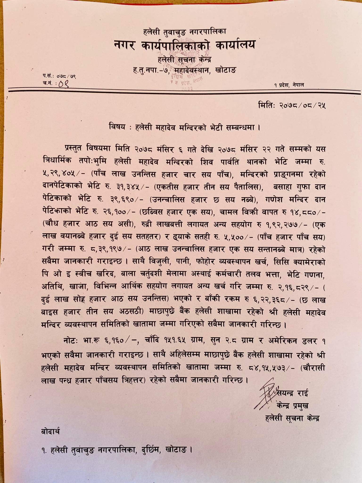 उल्लिखित खर्च कटाएर बाँकी ६ लाख २२ हजार ३६८ रुपैयाँ श्री हलेसी महादेव मन्दिर व्यवस्थापन समितिको नाममा माछापुच्छ्रे बैंक हलेसी शाखामा जम्मा गरिएको छ ।