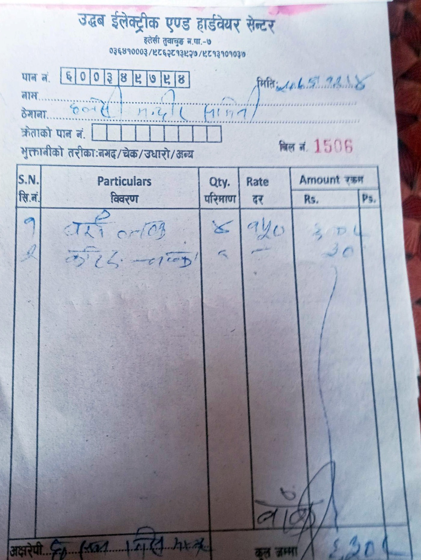 नयाँ चाभी खरिद गरेको बिल हर्कराजले देखाउन नमाने पनि तुवाचुङ डटकमले उद्धव इलेक्ट्रिक एन्ड हार्डवेयर सेन्टरबाट प्राप्त गरेको छ । बिलमा चार थान ‘घर्रा लक’को ६ सय र कटिङ चक्कुको ३० रुपैयाँ उल्लेख छ । भेटीघाटीमा तर मारिरहनेलाई ६३० रुपैयाँ धेरै नलाग्ला । तर पसिना बगाएर कमाउनेलाई ६३० थोरै होइन । हर्कराज राईले व्यक्तिगत रूपमा ६३० बेहोर्थे भने काम सकिनासाथ किन भुक्तानी गरेनन् । राईले जब उधारोमा काम लगाए, त्यहाँबाट प्रस्ट हुन्छ कि व्यक्तिगत रूपमा खर्च गर्न उनको दाँतबाट पसिना आयो ।