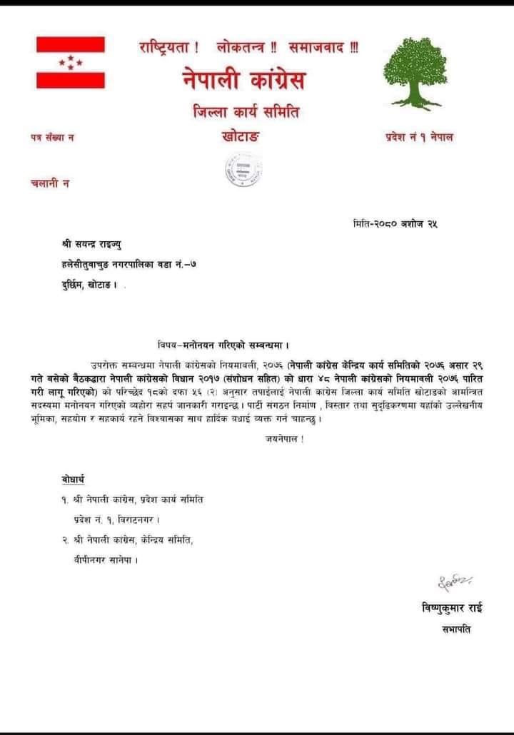 पार्टी संगठन निर्माण, विस्तार तथा सुदृढीकरणमा उल्लेखनीय भूमिका, सहयोग र सहकार्य गर्न राईलाई नेपाली कांग्रेस जिल्ला कार्यसमिति खोटाङ आमन्त्रित सदस्यमा मनोनयन गरेको कांग्रेस खोटाङले जनाएको छ ।