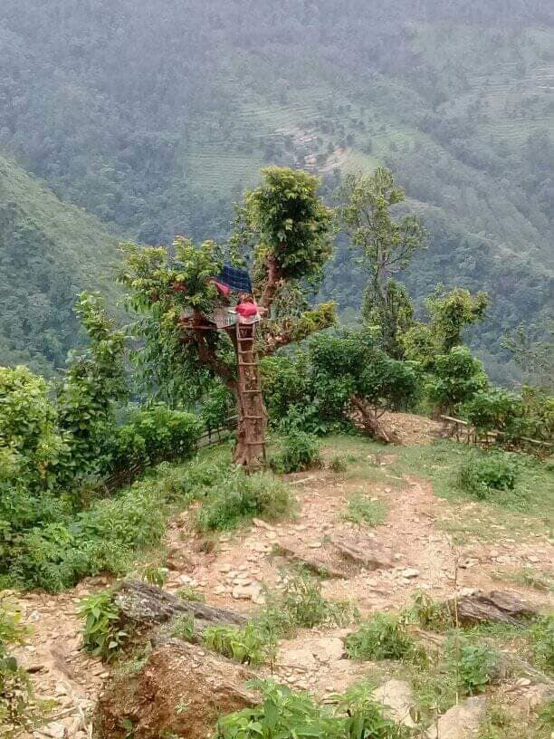 हाडेको रूख । त्यही रूखमा करमको भर्याङ ठडिएको छ । रूख चढ्न सात खुड्किलो पार गर्नुपर्छ । उनले रूख चढ्नसाथ रूखमै किताबसहितको झोला झुन्ड्याउँछन् । छाता एक छेउमा राख्छन् । त्यसपछि चट्टाइ (एकप्रकारको गुन्द्री) बिछ्याउँछन् । लगत्तै दुईवटा बर्को रूखमै टाँग्छन् । यत्ति गरेपछि अनलाइन कक्षा लिन बस्छन् ।