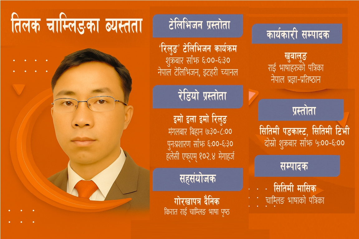 नेपाल प्रज्ञाप्रतिष्ठानबाट प्रकाशन हुने ‘खुवालुङ’ पत्रिकाको कार्यकारी सम्पादकको भूमिकामा छन् । खुवालुङ राई समुदायमा बोलिने भाषाहरूको पत्रिका हो । गोरखापत्र दैनिकमा चाम्लिङ राई भाषा पृष्ठ संयोजन उनैले गर्छन् । एक व्यक्ति अनेक भूमिकामा अनुहारिएका पत्रकार, लेखक तथा कवि तिलक चाम्लिङसँग तुवाचुङ डटकमका लागि दीपेन्द्र राईले गरेको कुराकानीको सम्पादित अंश :