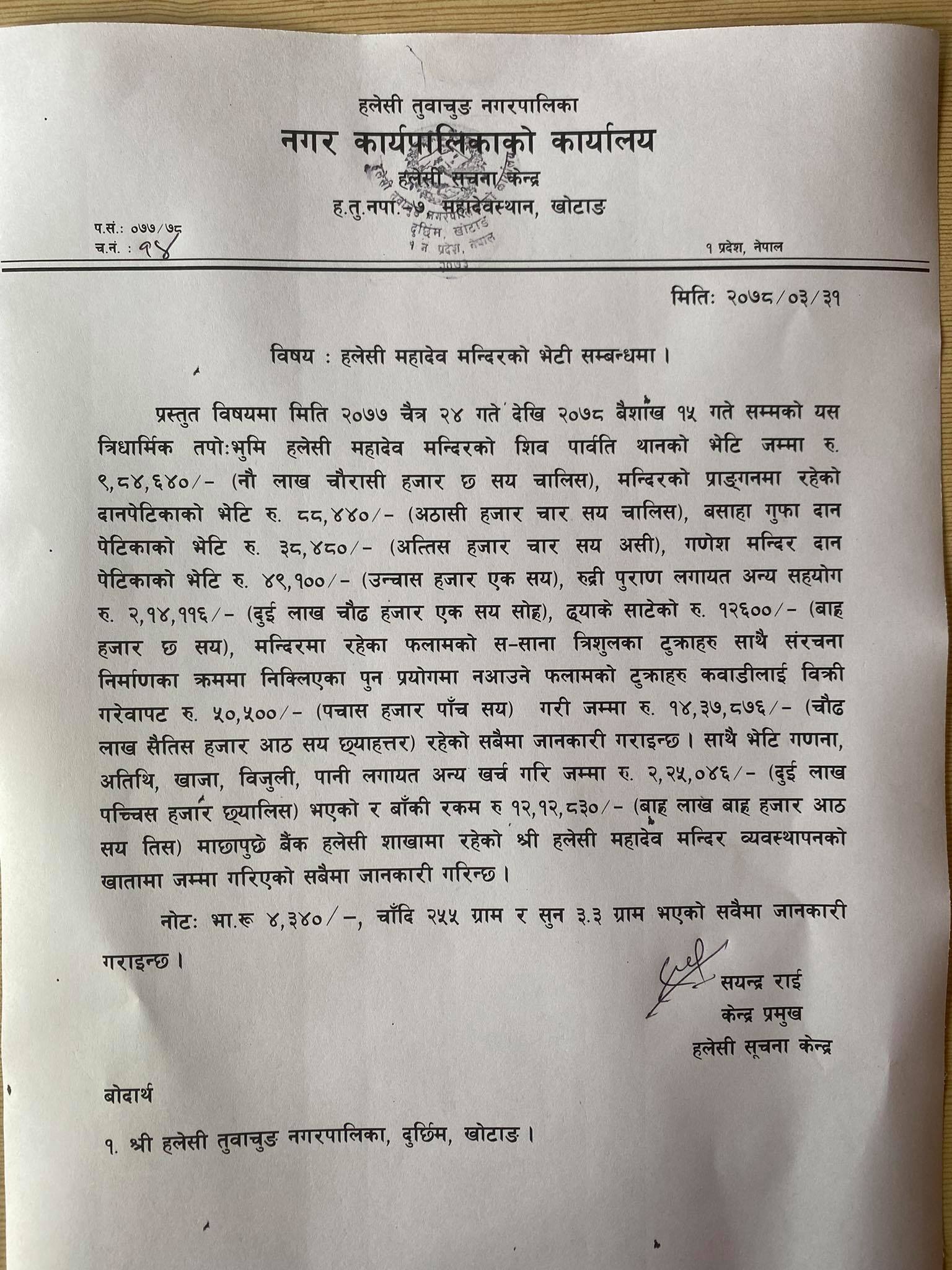 भेटी गणना गर्दाको खर्च कटाएर १२ लाख १२ हजार ८ सय ३० रुपैयाँ श्री हलेसी महादेव मन्दिर व्यवस्थापन समितिको नाममा माछापुच्छ्रे बैंक हलेसी शाखामा जम्मा गरिएको छ ।