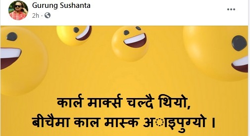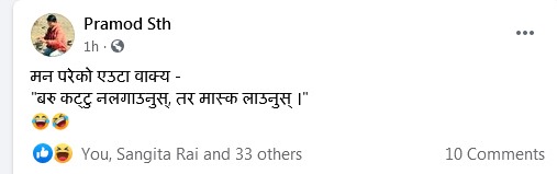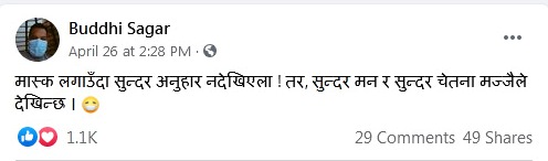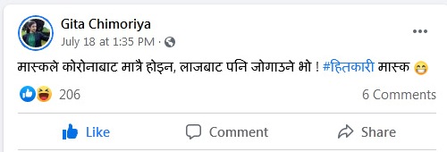 कोरोना कहरमा मास्क प्रयोगलाई दृष्टिगत गर्दै धेरैले सामाजिक सञ्जालमार्फत अभिव्यक्ति सार्वजनिक गरे । ‘मास्कले कोरोनाबाट मात्रै होइन,’ पत्रकार गीता चिमोरियाको ठम्याइ छ, ‘लाजबाट पनि जोगाउने भो । हितकारी मास्क ।’