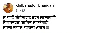 कोरोना कहरमा ‘दुई मिटरको दूरी, मास्क जरुरी’ भन्ने गरिन्थ्यो । त्यस्तो जागरण फैलाउनसम्म फैलाइयो । जुन अति आवश्यक पनि थियो । ‘मचाहिँ कोरोनाबाट बच्न मास्कवादी, विचलनबाट जोगिन माक्र्सवादी,’ पत्रकार खिलबहादुर भण्डारीले सुझाए, ‘मास्क लगाम्, कोरोना भगाम् ।’