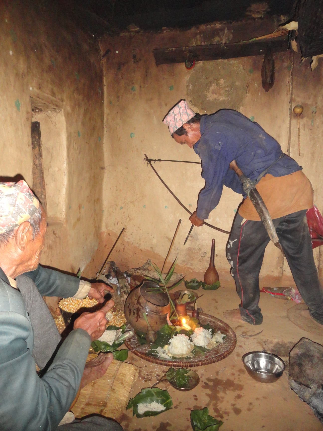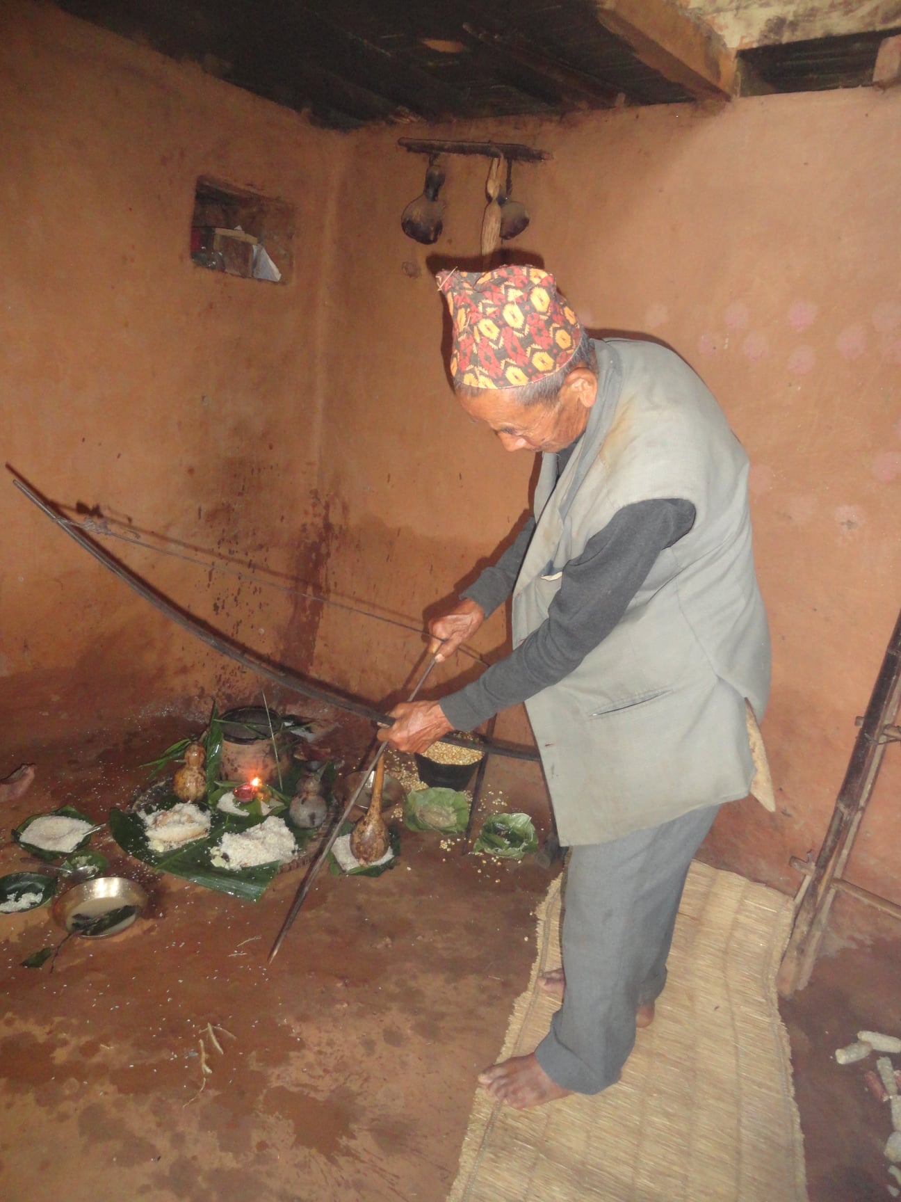 छौवा गर्दा नियामा भन्ने आदिम थलोको उल्लेख हुँदा धनुकाँडले बँदेललाई ताकेको अभिनय गरिन्छ । साल्पा भन्ने प्राचीन थलोको उल्लेख हुँदा कस्तूरी (?) लाई ताकेको अभिनय गरिन्छ । र, घरको उल्लेख हुँदा घरपालुवा सुँगुरलाई ताकेको अभिनय गरिन्छ ।