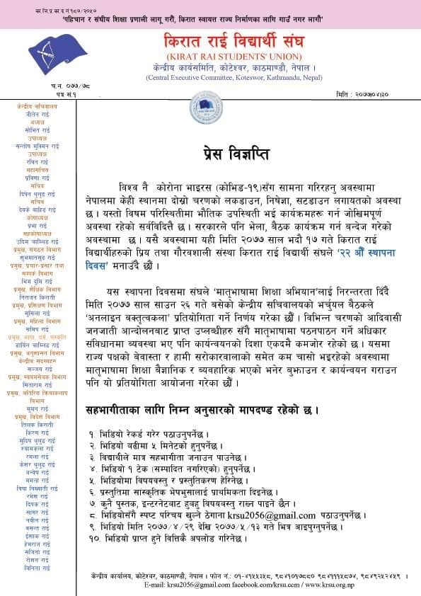 काठमाडौं । किरात राई विद्यार्थी संघले २२औं स्थापना दिवसको अवसर पारेर ‘अनलाइन वक्तृत्वकला’ गर्ने भएको छ । संघले ‘मातृभाषामा शिक्षा’ विषयक अनलाइन वक्तृत्वकला गर्न लागेको हो ।