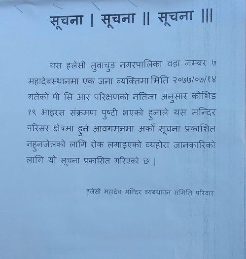श्री हलेसी महादेव मन्दिर व्यवस्थापन समिति परिवारले एक विज्ञप्ति जारी गर्दै हलेसी गुफा परिसर क्षेत्रमा आवागमन रोक लगएको छ । वडाका दुईजनामा कोरोना संक्रमित पुष्टि भएपछि समितिले अर्को सूचना प्रकाशित नभएसम्म गुफा परिसर आवागममा रोक लगाएको हो ।
