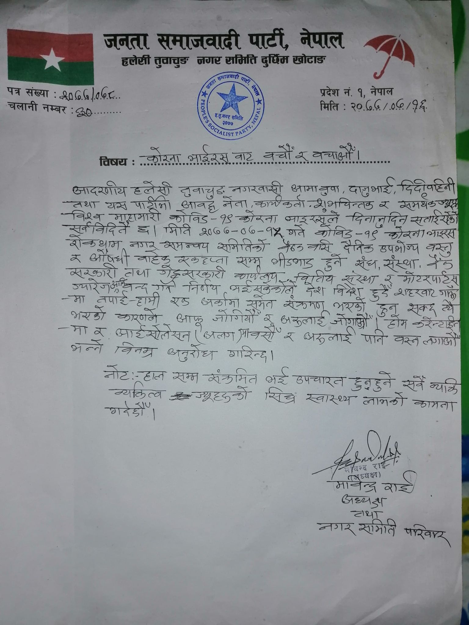 त्यसैगरी, जनता समाजवादी पार्टी नेपाल, हलेसी तुवाचुङ नगर समिति अध्यक्ष मविन्द्र राईले विश्वव्यापी महामारीबाट बचौं र बचाऔं भन्दै विज्ञप्ति जारी गरेका छन् । नगर समिति अध्यक्षद्वारा जारी विज्ञप्तिमा भनिएको छ, ‘देश–विदेशबाट गाउँठाउँसम्म आइपुगेका तपाईं–हामीमध्ये जोकोही संक्रमित हुन सक्छौं । संक्रमितले संक्रमण सार्न सक्छौं । तसर्थ, हामी आफैं जोगिऔं र अरूलाई जोगाऔं । त्यस्ता भेटिए वा थाहा पाएमा होम क्वारेन्टाइन वा सेल्फ आइसोलेसनमा बसौं । बस्न लगाऔं ।’