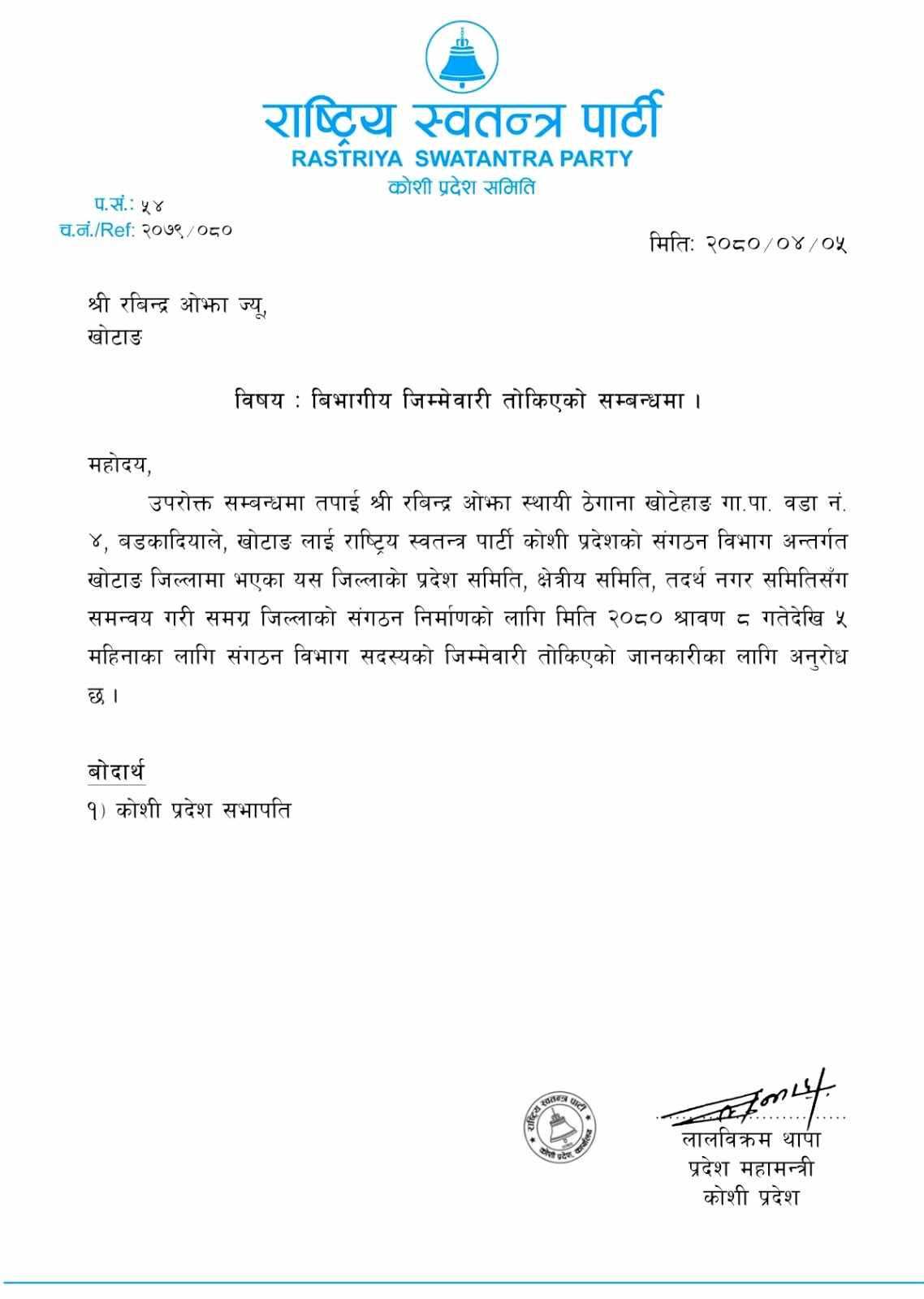 दुर्छिम (खोटाङ) । राष्ट्रिय स्वतन्त्र पार्टी कोसी प्रदेश समितिले युवा नेता रवीन्द्र ओझालाई खोटाङको संगठन निर्माणको जिम्मेवारी दिएको छ ।