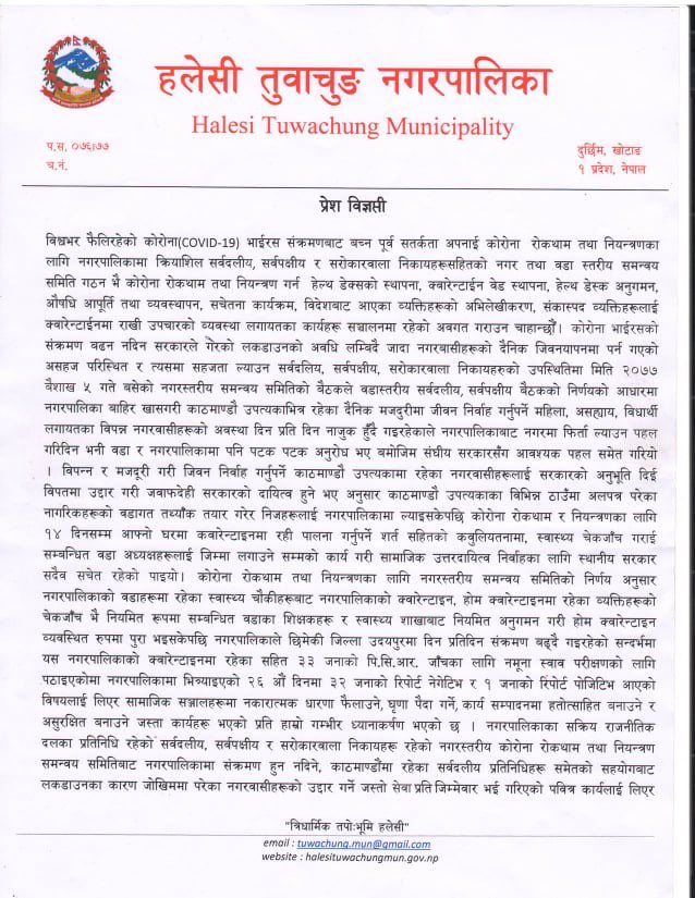 स्वास्थ्यचौकी र सुरक्षा निकायबाहेक हलेसी तुवाचुङ नगरपालिका र नगरका ११ वटै वडा कार्यालय बन्द गरिएका छन् । शैक्षिक संस्था भने पहिल्यैदेखि बन्द थिए । नगरपालिका ‘सिल’ गरेपछि दैनिक उपभोग्य सामग्री किनबेचका लागि बिहान र बेलुका निश्चित समय तोकिएको छ भने बाँकी समय पसलसमेत बन्द गरिने भएको छ ।