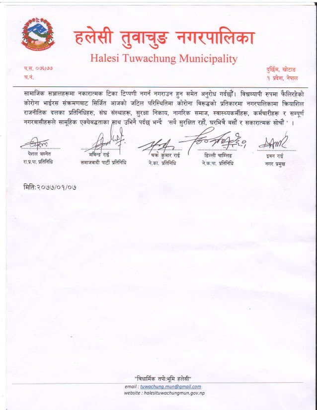 मंगलबार बिहान हलेसीमा रहेको महेन्द्रोदय माध्यमिक विद्यालयमा १ घन्टा बसेको सर्वदलीय बैठकले निर्णय गरेलगत्तै नगरपालिका ‘सिल’ गरिएको हो । बैठकले समयसीमा नतोके पनि परिस्थिति हेरेर ‘सिल’ खोलिने हलेसी तुवाचुङ नगरपालिकाका नगरप्रमुख इवन राईले जानकारी गराए ।