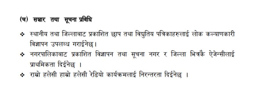 नगरको प्रस्तावित नीति तथा कार्यक्रमको ‘सञ्चार तथा सूचना प्रविधि’ शीर्षकमा हलेसी तुवाचुङ नगरपालिकाबाट प्रकाशन गरिने सूचना तथा विज्ञापन हलेसी तुवाचुङ नगरपालिका र जिल्लाभित्रकै विज्ञापन एजेन्सी वा पत्रकारलाई प्रकाशित गर्न दिने उल्लेख छ ।