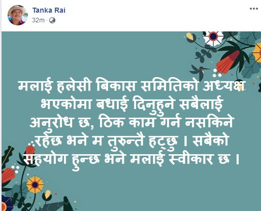 ‘मलाई हलेसी महादेवस्थान विकास समितिको अध्यक्ष भएकोमा बधाइ दिनुहुने सबैलाई अनुरोध छ,’ नवनियुक्त अध्यक्ष टंक राईले सामाजिक सञ्जाल फेसबुकमार्फत अनुरोध गरेका छन्, ‘ठीक काम गर्न नसकिने रहेछ भने म तुरुन्त हट्छु । सबैको सहयोग हुन्छ भने मलाई स्वीकार छ ।’
