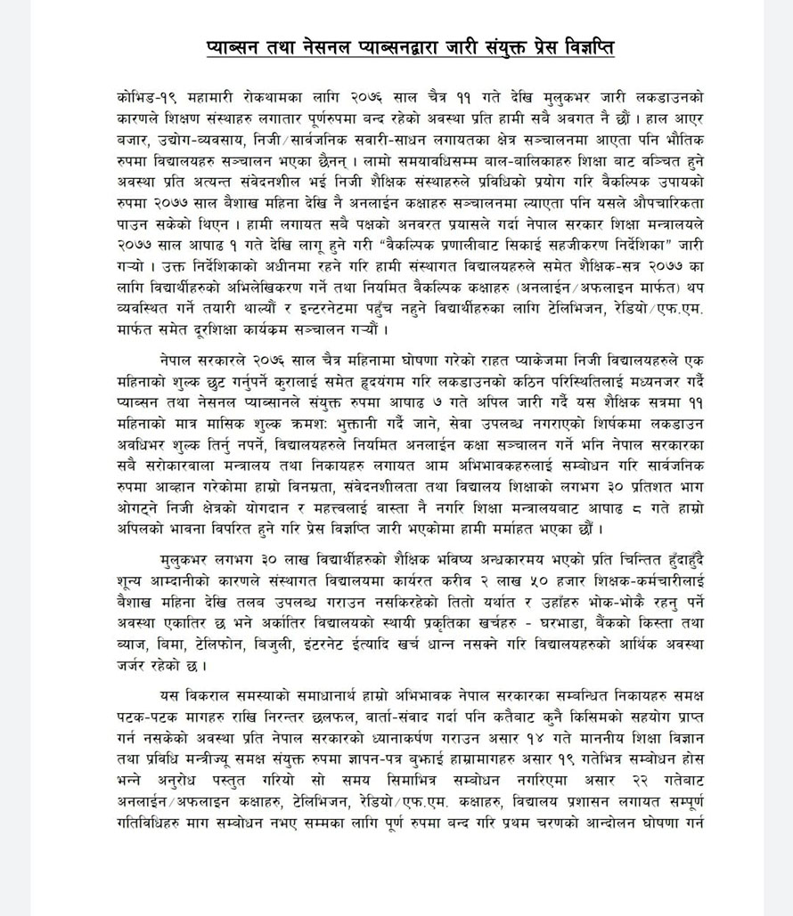 कोभिड–१९ महामारी रोकथामका लागि २०७६ साल चैत ११ गते देखि मुलुकभर जारी लकडाउनका कारणले शिक्षण संस्था लगातार पूर्ण रूपमा बन्द रहेको अवस्थाप्रति हामी सबै अवगत छौं । हाल आएर बजार,